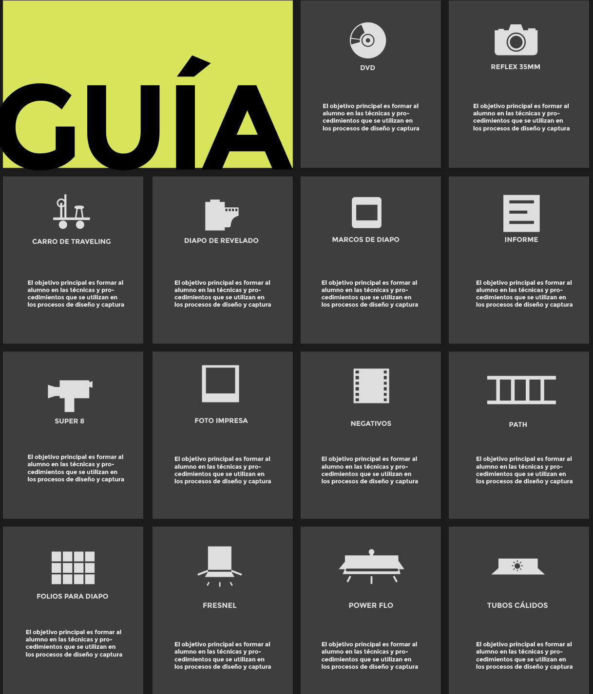 La idea es que los alumnos se agrupen, `presenten una idea de guión y, con el apoyo y la ayuda de los docentes, logren concretar su filmación al final de la cursada. Para eso, cuentan con todos los elementos técnicos disponibles en la facultad, que utilizan bajo la supervisión de un docente a cargo. De esta forma, los alumnos que se destacan por su interés hacia la materia y se involucran con sus contenidos, tienen la oportunidad de llevar a la práctica los conocimientos adquiridos durante el cuatrimestre.