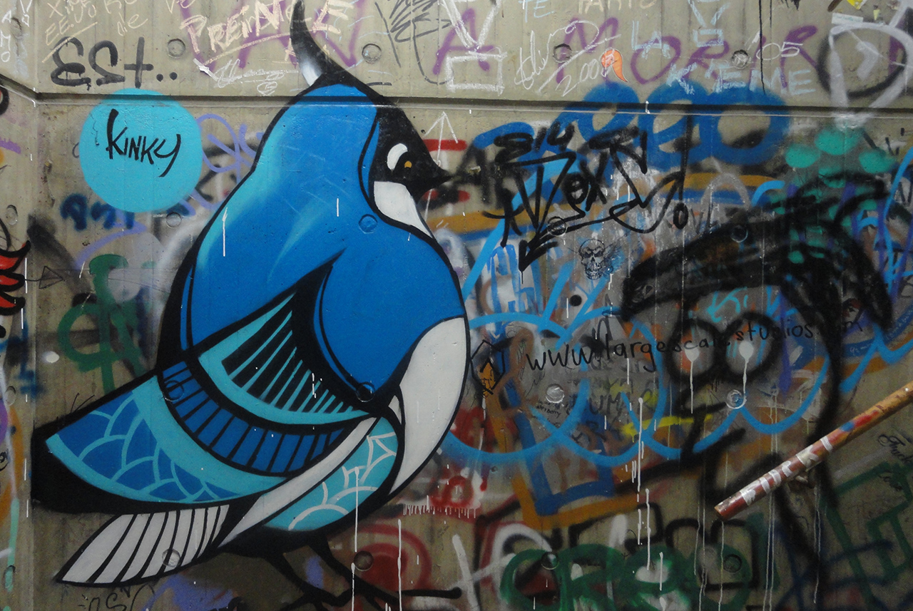 Graffitti ubicado en escalera de emergencia 2°Piso en frente al río.— Kinky