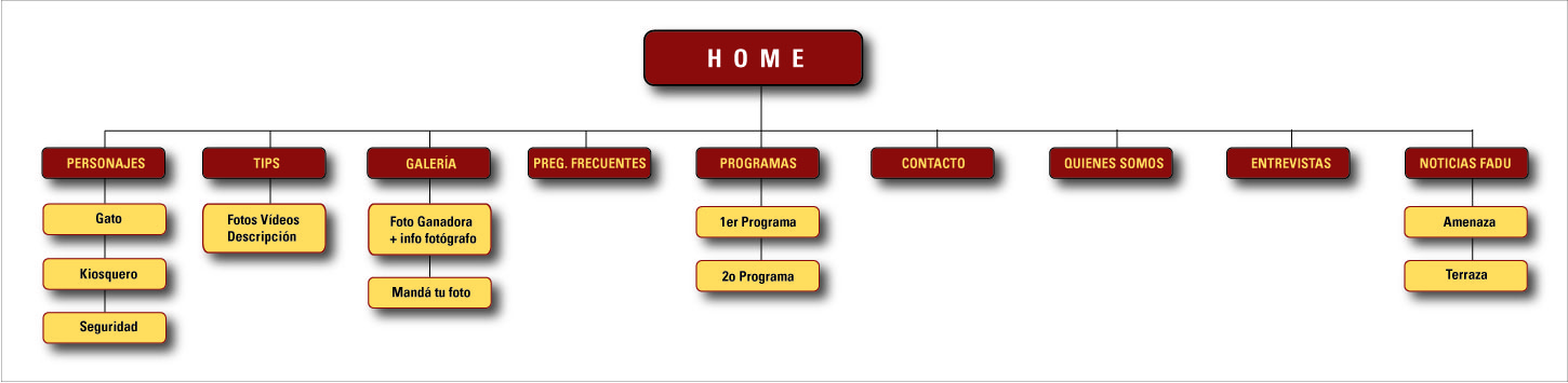 El sitio cuenta con una BOTONERA PRINCIPAL: -INICIO -PROGRAMAS -CONTACTO -FOTOS PERSONAJES -PREGUNTAS FRECUENTES -LISTA DE TIPS Tiene un sector donde se encuentra el PROGRAMA DE LA SEMANA Debajo está la DESCRIPCIÓN DEL PROGRAMA. A la derecha tiene un sector para ver los PROGRAMAS ANTERIORES Debajo un lugar para CONTACTARSE con el programa REDES SOCIALES PÁGINAS ÚTILES.