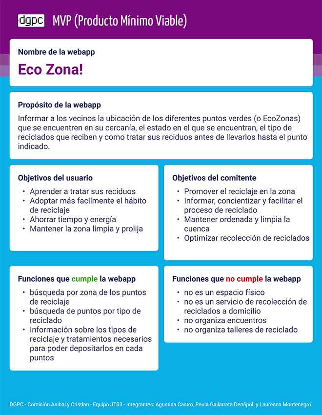 La webapp se enfoca en Informar a los vecinos la ubicación de las diferentes EcoZonas que se encuentren en su cercanía, el estado en el que se encuentran, el tipo de reciclados que reciben y como tratar sus reciduos antes de llevarlos hasta el punto indicado.