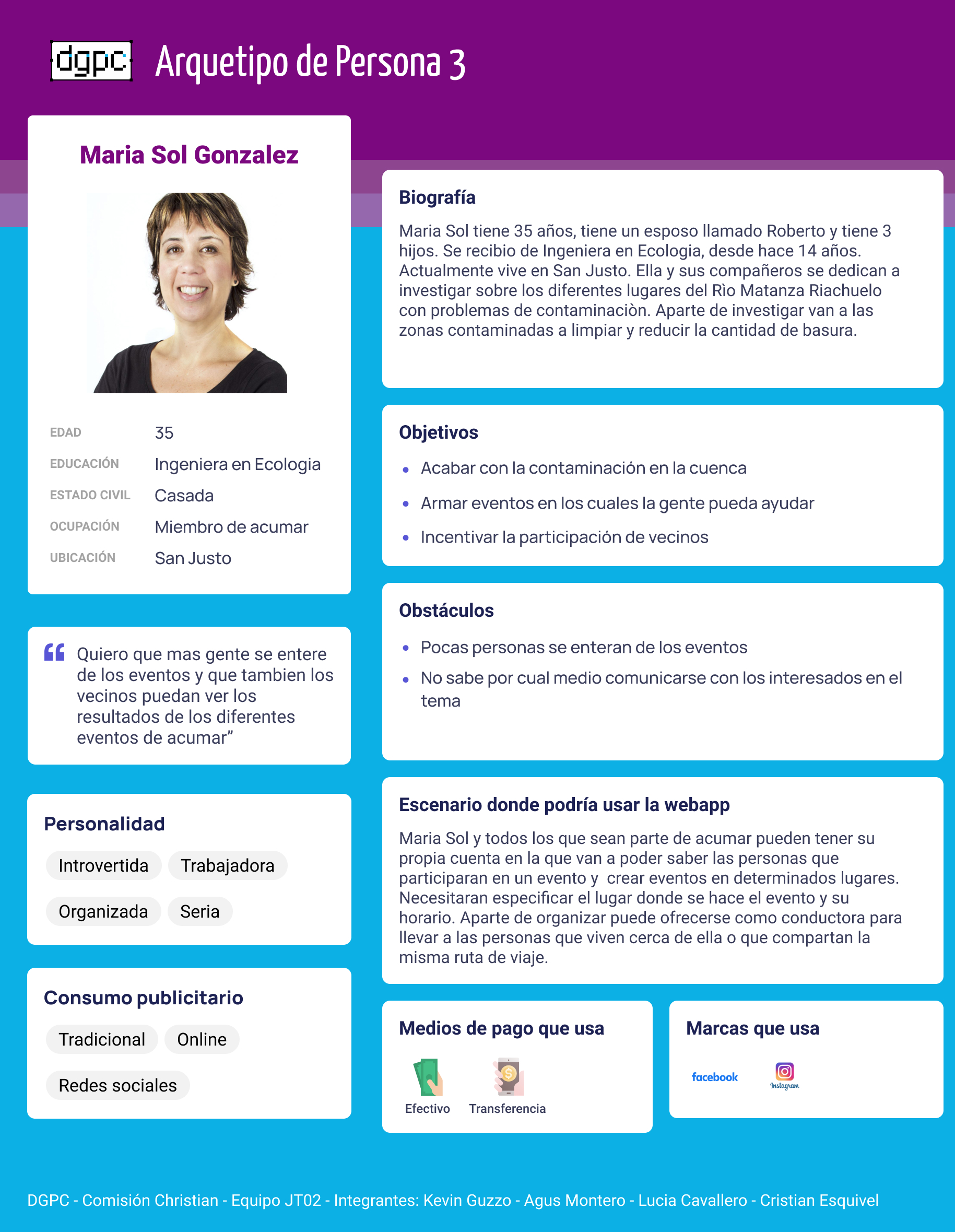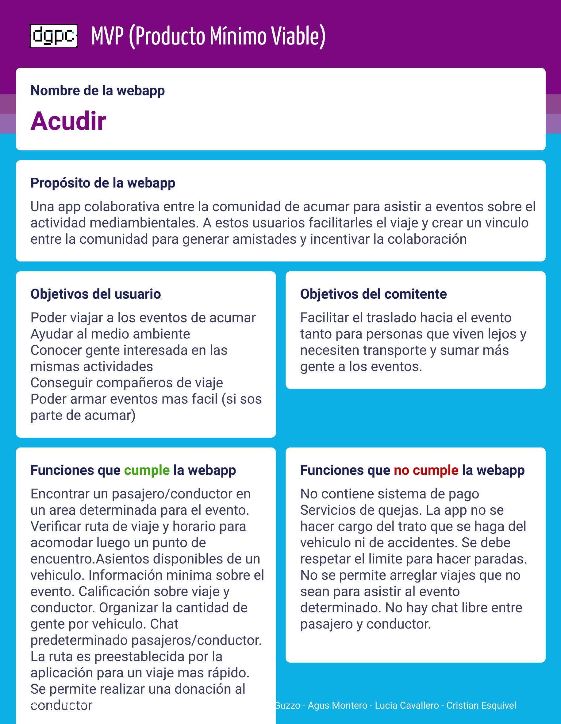 Para el desarrollo de nuestra WebApp decidimos tomar como problemática las distancias y el uso de transporte que tendrían las personas pertenecientes a la comunidad de ACUMAR, al querer asistir a los distintos eventos de concientización y ayuda solidaria realizados por estos mismos. Proponemos como solución una aplicación colaborativa, enfocada a que los usuarios puedan encontrar transporte fácilmente dentro de la comunidad, como también, ofrecer transporte si es que tienen lugares de más, y así poder compartir el viaje con otros que lo necesiten dentro de la comunidad. Es una idea basada en el término “carpoolear”, se trata de compartir el viaje, viajar en grupo para bajar costos, llegar más rápido y contaminar menos.