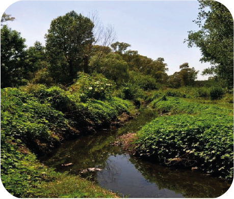 El cauce, que ingresa entubado desde la provincia de Buenos Aires, mantiene un entorno natural, con arboledas y una amplia vegetación que acompañan el recorrido lento del caudal de agua de lo que alguna vez fue un río y ahora es casi un arroyo.