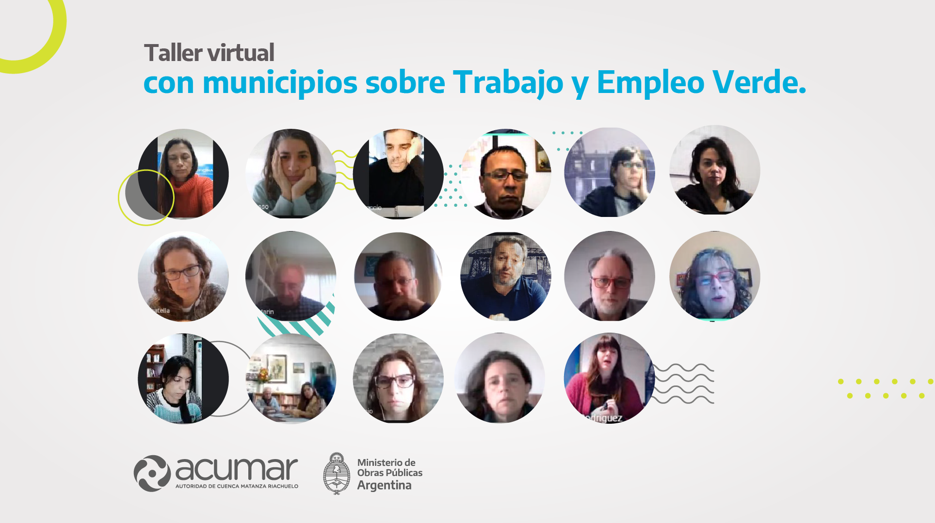 El primero de dos encuentros en los que ACUMAR y el Ministerio de Trabajo, Empleo y Seguridad Social de la Nación convocaron a las áreas de Trabajo, Producción y Ambiente de los municipios de la Cuenca Media a un taller virtual sobre trabajo y empleo verde y la transición justa a nivel local. Participaron representantes de los municipios de La Matanza, Ezeiza, Merlo, Morón, Esteban Echeverría y Almirante Brown.