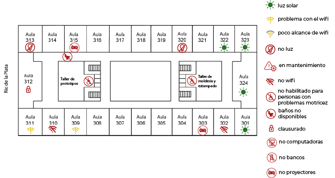 El principal inconveniente radica en que las imágenes se proyectan en pizarrones demasiado pequeños, lo que dificulta la visibilidad. Los estudiantes que no tienen la suerte de sentarse en las primeras filas a menudo se encuentran con que no pueden ver claramente lo que se está proyectando. Lo mismo pasa cuando no funcionan los micrófonos, los que se encuentran al fondo del aula no pueden escuchar con claridad lo que el profesor está diciendo.