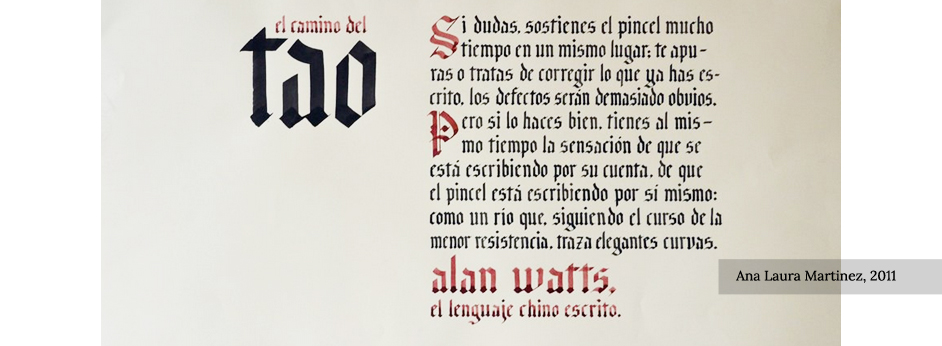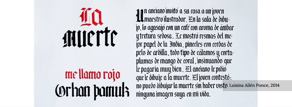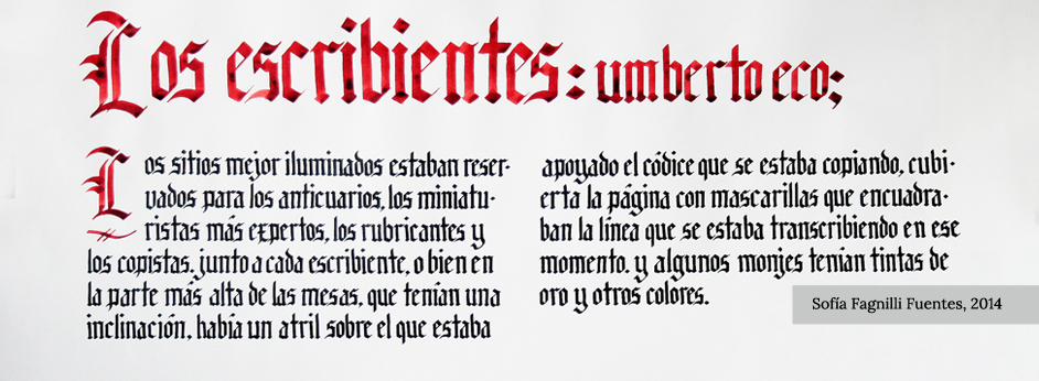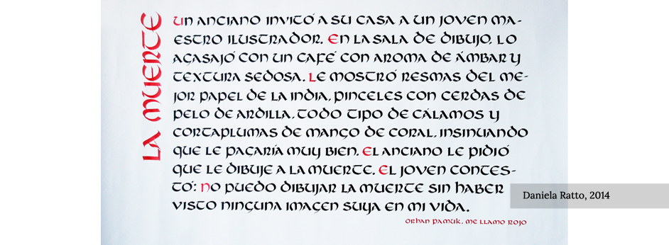 Apropiación del recurso caligráfico permitiendo la comprensión del comportamiento del trazo gradual, la forma subyacente y la construcción del ductus de cada tipo de escritura. Los diferentes bloques de texto permiten la asociación entre el color de los signos y las relaciones espaciales que determinan el color del bloque.