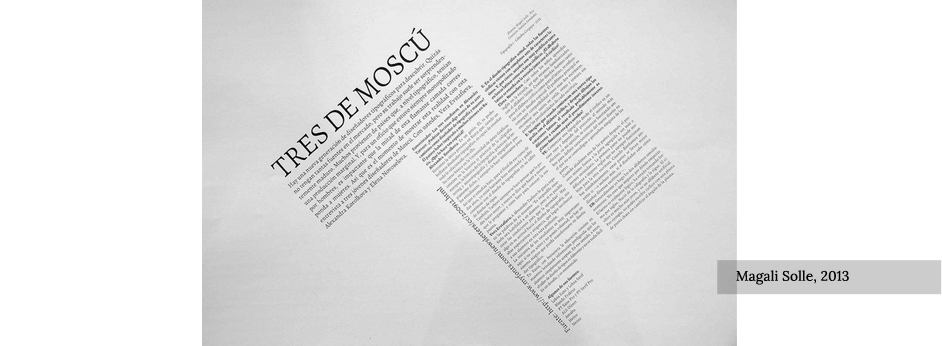 Luego de elegir una familia tipográfica, en principio la práctica se realiza componiendo el título en mayúsculas en un cuerpo de texto relativamente grande de modo tal que el espacio que queda entre las letras se perciba como siempre igual. Además, en la composición de los párrafos, se deberán trabajar con gran importancia las distintas variables tipográficas para poder resolver las distintas voces ya que se trata de una entrevista, y se debe controlar siempre la homogeneidad del color en el justificado. En la composición se tendrán en cuenta, el título, la introducción, el bloque de texto, la ficha, la fuente del reportaje y el rótulo.
