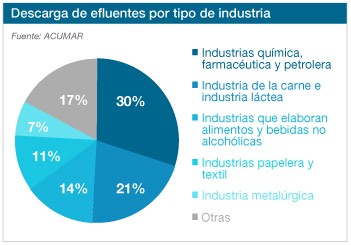 Unas 6.300 industrias se agolpan alrededor del río Matanza-Riachuelo vertiendo diariamente 88.000 m3 de residuos industriales en él (sólo el 3% de las empresas tratan y sanean las aguas que ensucian antes de verterlas al río). Como consecuencia de ello, el Riachuelo tiene concentracinoes de mercurio, zinc, plomo y cromo superiores en 50 veces a los niveles máximos permitidos. También se encuentran todo tipo de dioxinas, furanos, cadmio, niquel, arsénico, selenio, fenoles, bencenos, xileno, tolueno, hidrocarburos clorados, pesticidas.